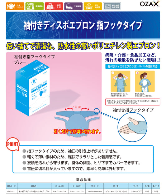 袖つきディスポエプロン 指フックタイプ ブルー 20枚/箱