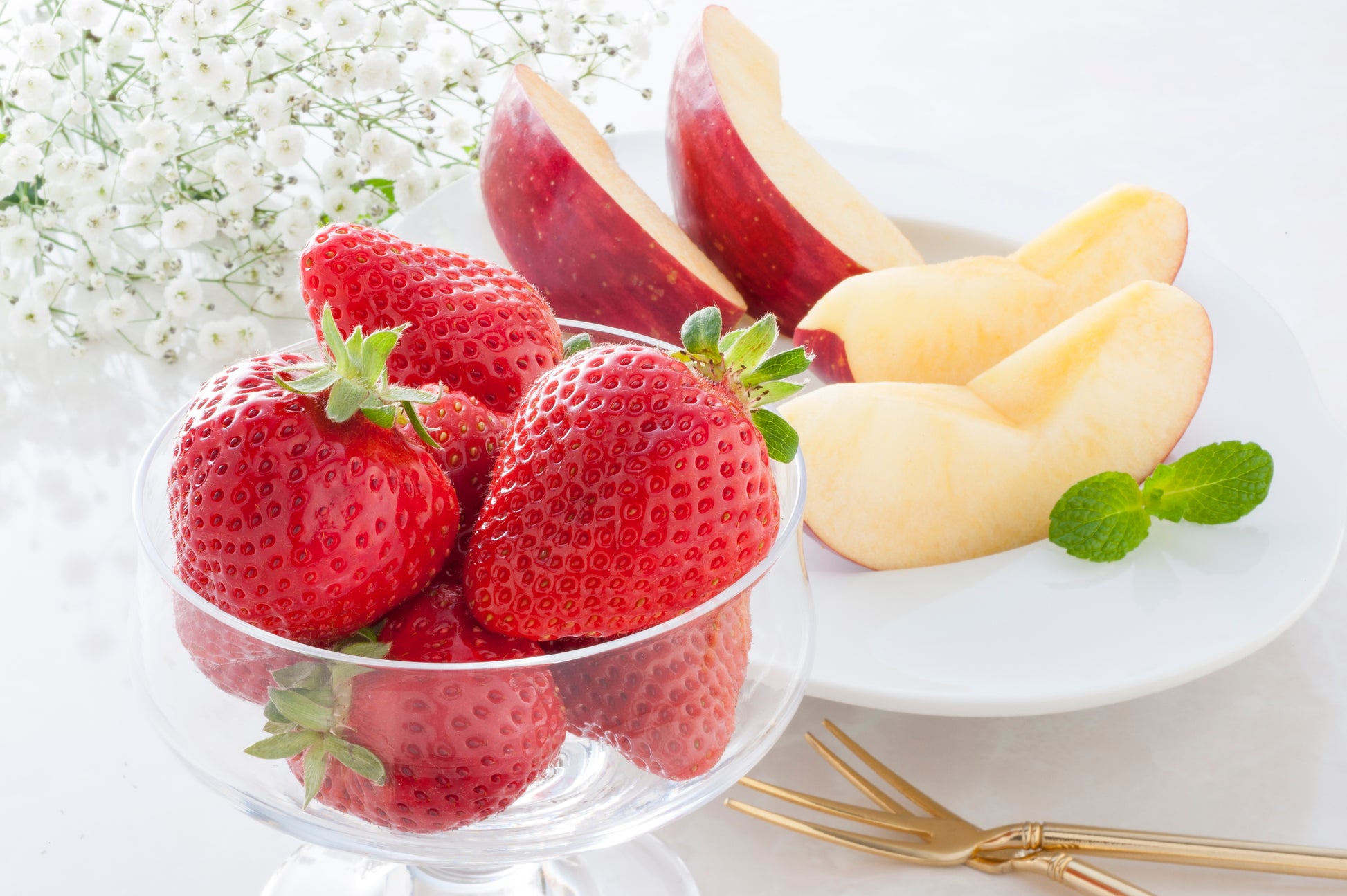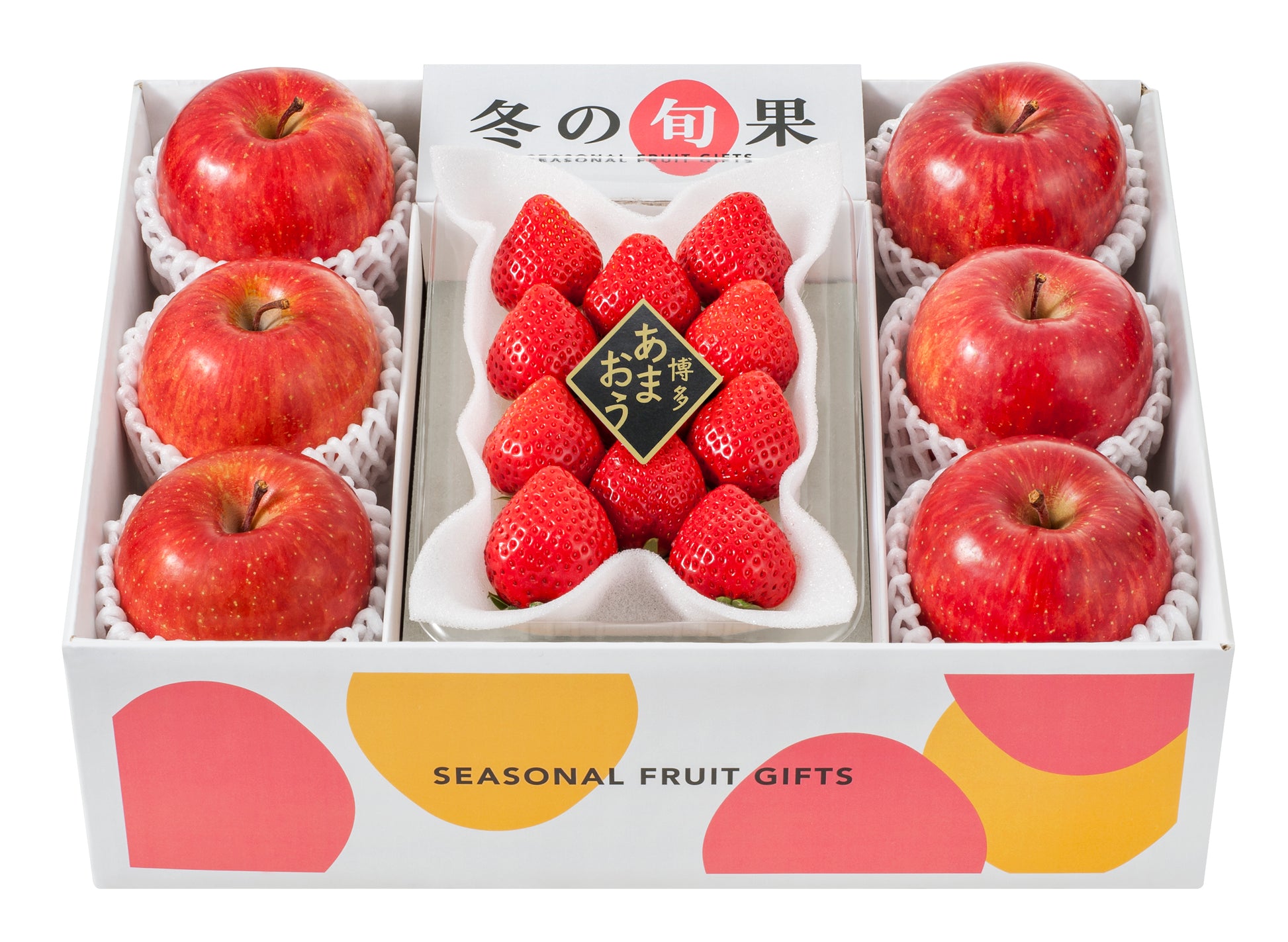 「あかい」「まるい」「おおきい」「うまい」の頭文字を取って名づけられた博多あまおういちごと、甘さと酸味のバランスが良い青森県産サンふじ林檎との詰合せ。