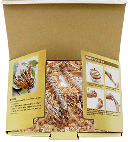 ご注文を頂いてから活きの良い海老を手作業で選び、オガクズをたっぷり敷き詰めた配送用の箱へ並べていきます。この様な工夫をすることで、最高級の車えびを県外のお客様へ「活きたままの新鮮さ」でお届けします。