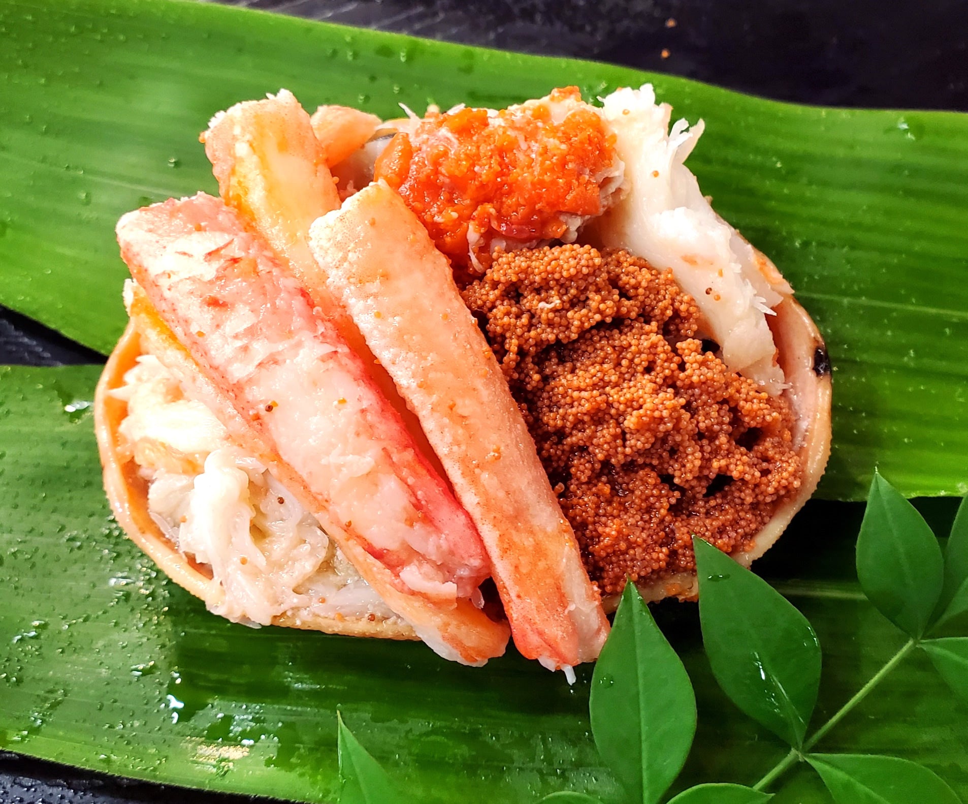 子持ち蟹は松葉ガニ(ズワイガニ)のメスです。手のひらサイズ(甲羅幅7.5cmほど)の蟹ですが、かに身だけでなく、かにみそ、内子・外子がきっしりと詰まっています。